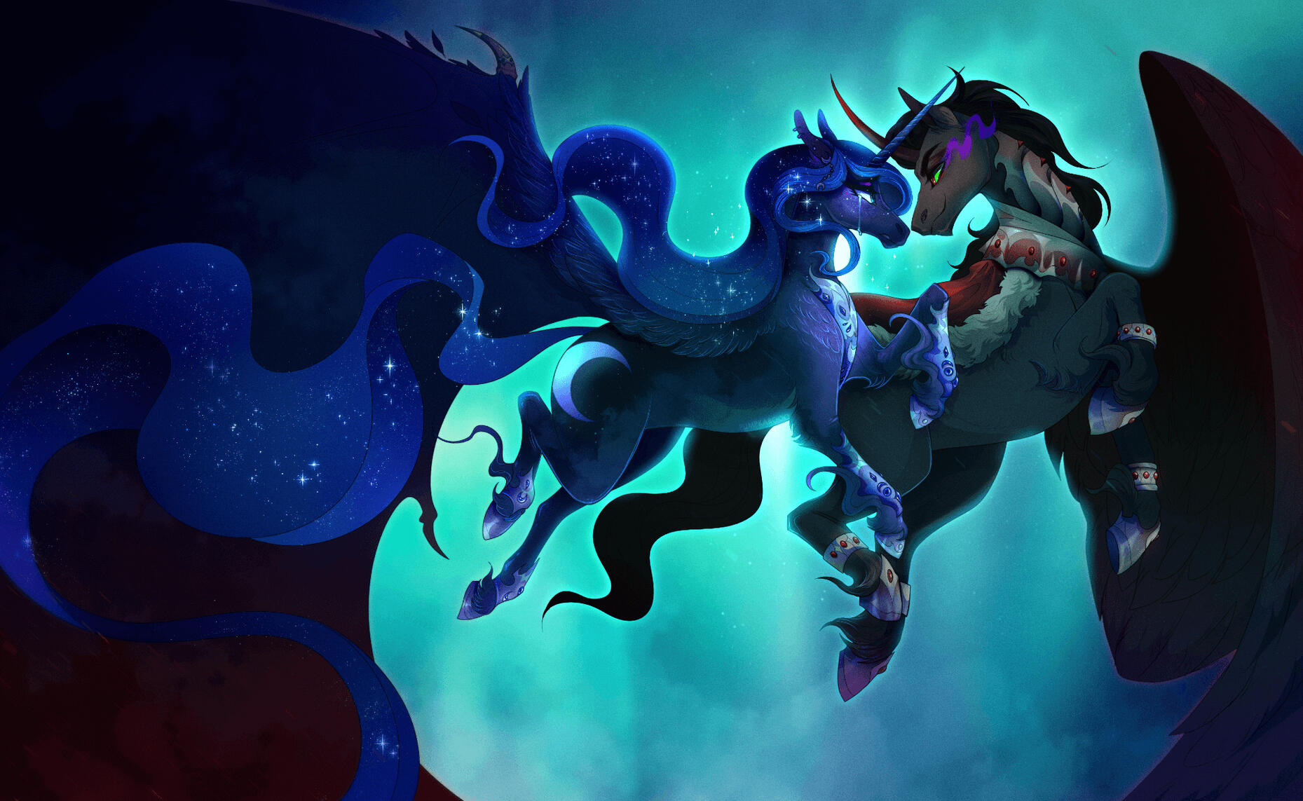 The backgrounds included in my prices are "simple"; a simple background is defined as painted skies, natural landscapes, fields, forests, etc. A complex background might add a fee of $5-10. Things that raise a background's complexity are mostly manmade structures: buildings, cities, cluttered indoor scenes, etc!